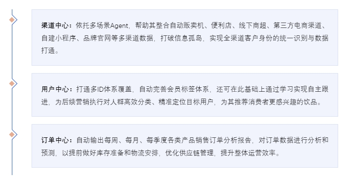 针对2C泛零售领域,Marketingforce紧密围绕门店、渠道、供应链、运营和营销等关键环节,专注为合作伙伴企业打造一体化业务中台。通过设立销售中心、营销中心、订单中心、库存中心等多个中台板块,结合自研的AI-Agentforce智能体中台,提升企业对市场变化的反应速度、决策能力以及预测水平,实时优化营销漏斗,全方位提升品牌服务能力和市场竞争力。