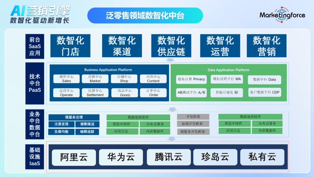 Marketingforce认为,AI Agent与业务中台的深度耦合将重塑产业格局:智能体通过自主学习持续优化业务逻辑,结合中台的能力沉淀,可构建具备自进化特征的智能商业操作系统。