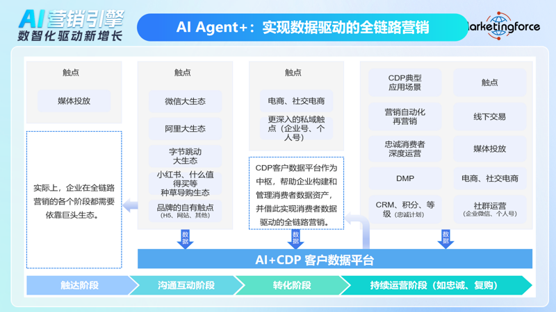 Marketingforce不断提升在前沿技术领域的“硬核实力”,快速迭代,敏捷创新。从数字化平台到智能化应用,深度整合了DeepSeek等最先进的大模型,开发出AI-Agentforce智能体中台,助力万企千业构建适配自身的业务中台,用全链路的智能经营方案,赋能企业创新增长。