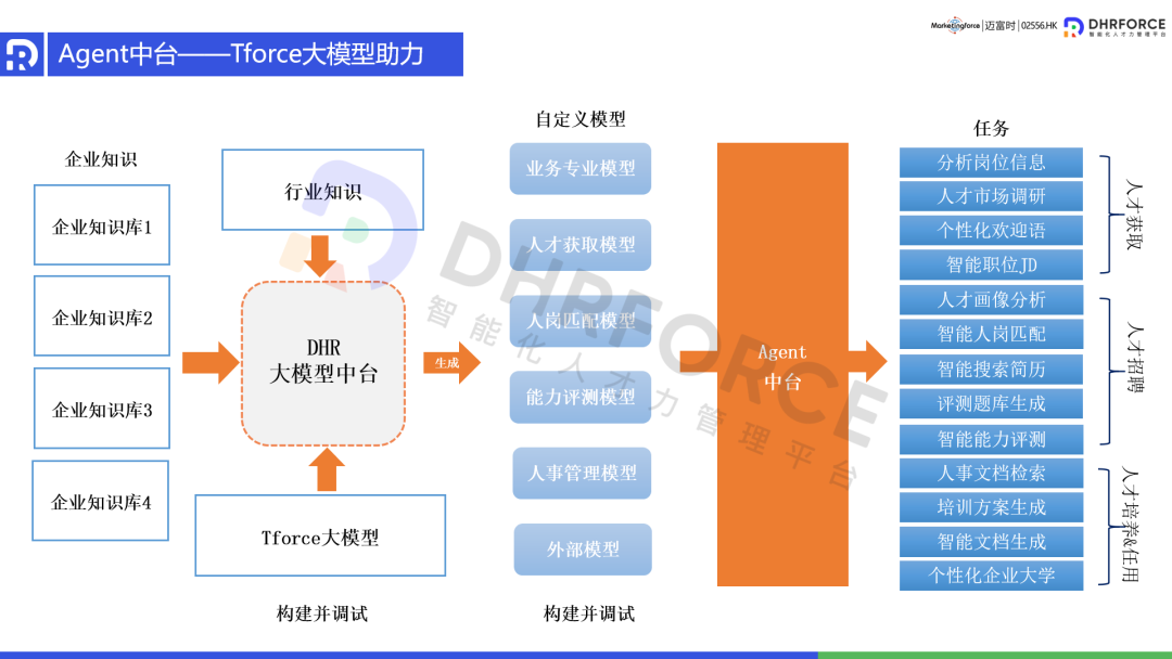 智能体中台作为DHRforce的“智慧中枢”,借助Tforce大模型的力量,在人力资源领域中实现了多种智能化应用。这些应用旨在提升人力资源管理的效率,增强人才与岗位的匹配度,并优化企业的人才招聘与培养过程。