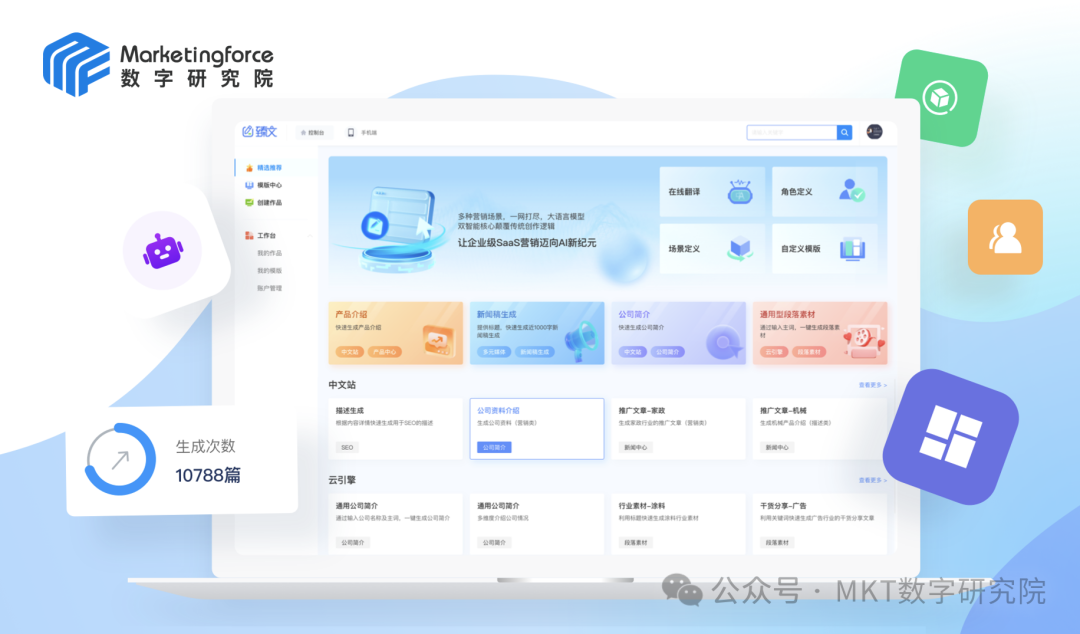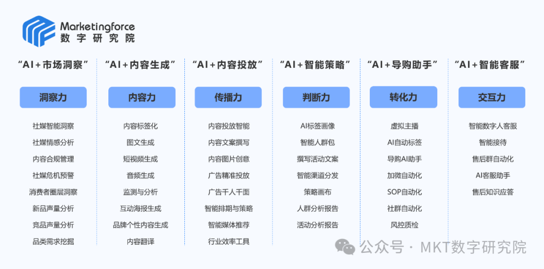 在企业营销的链路中,AI既可以参与到前期的市场分析和策略分析,将过往1-2个月的研调周期缩短到1-2天;又可以参与到内容创作、智能投放、运营服务的全阶段。