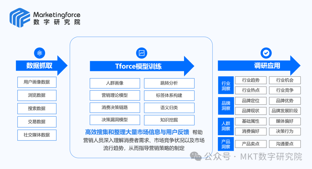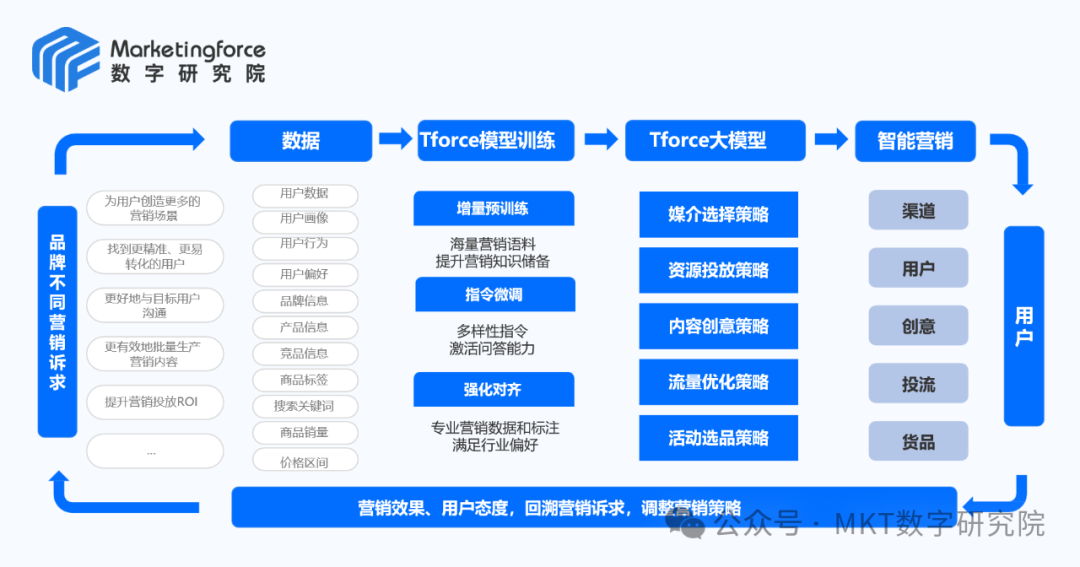 AI技术的引入大幅提升了数据处理效率,使得从海量数据中提取有价值信息(如用户特征和行为数据)变得更加快捷。同时,AI不仅可以自动化处理重复性任务,还能够通过深度融合营销分析模型(如Tforce大模型),提供全面的洞察和预测能力,极大地提升了营销数据分析的效能。