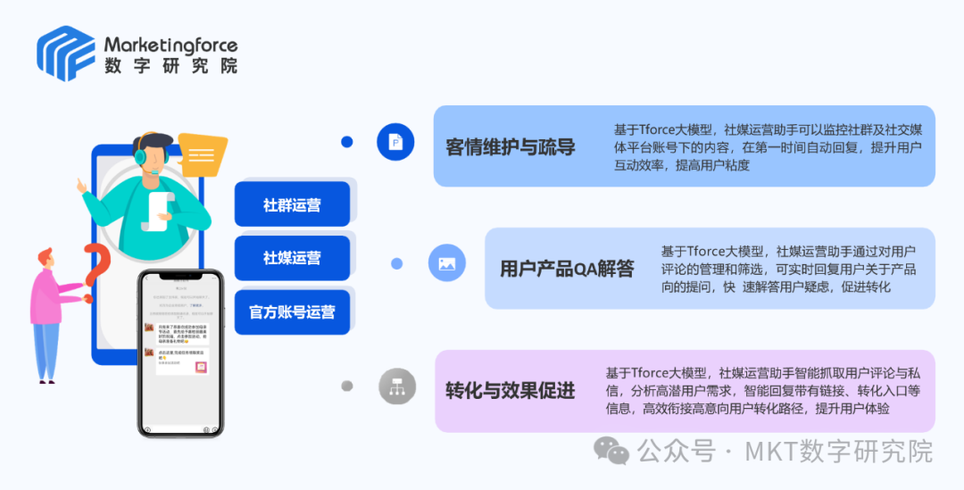 垂直领域的大模型专注于特定行业的数据和需求,通过深度学习和算法优化,智能体可以提供更精准的建议和决策。例如Marketingforce的Tforce营销大模型能够分析市场动态,预测消费者行为,并提供定制化的营销方案。这种从数据分析到策略执行的全链条智能化操作,使企业能够更灵活地应对市场变化,显著提升运营效率。