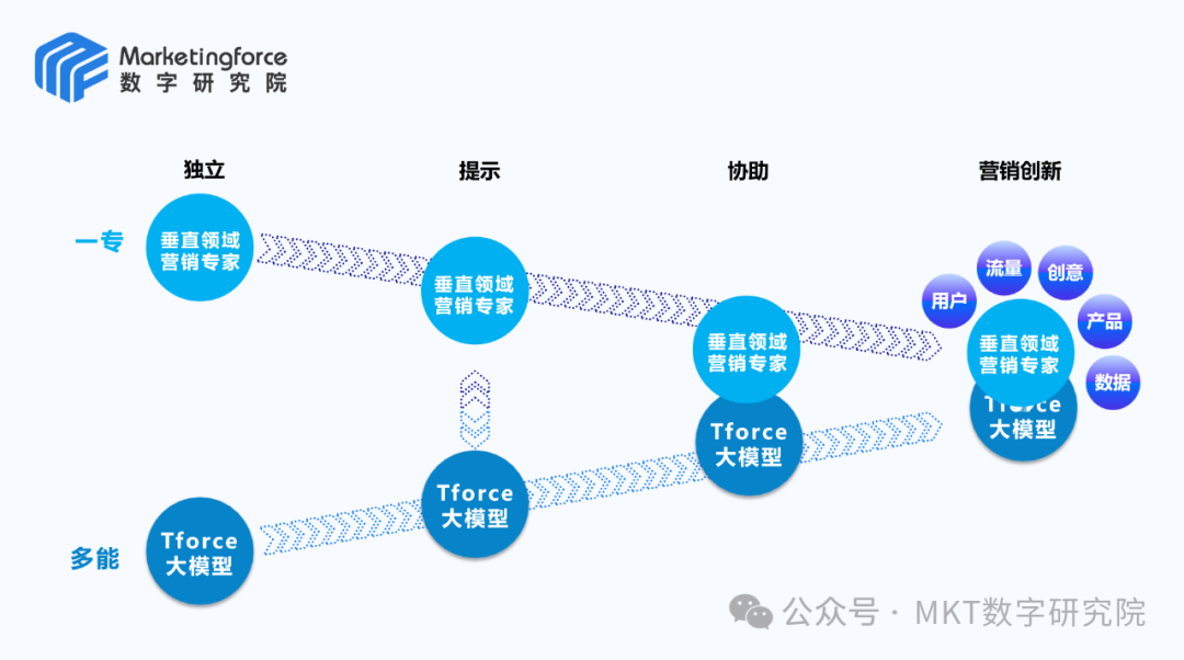 在此基础上,垂直领域大模型的引入进一步强化了这一趋势。以Marketingforce为例,垂直领域的Tforce营销大模型能够全面赋能营销数智化平台升级。垂直大模型不仅能处理海量数据,还能结合行业特点提供定制化的解决方案,进一步优化企业的决策过程。通过将AI和营销大模型相结合,企业能够实现从数据分析到策略执行的全链条智能化,推动数字化与智能化的深度融合。